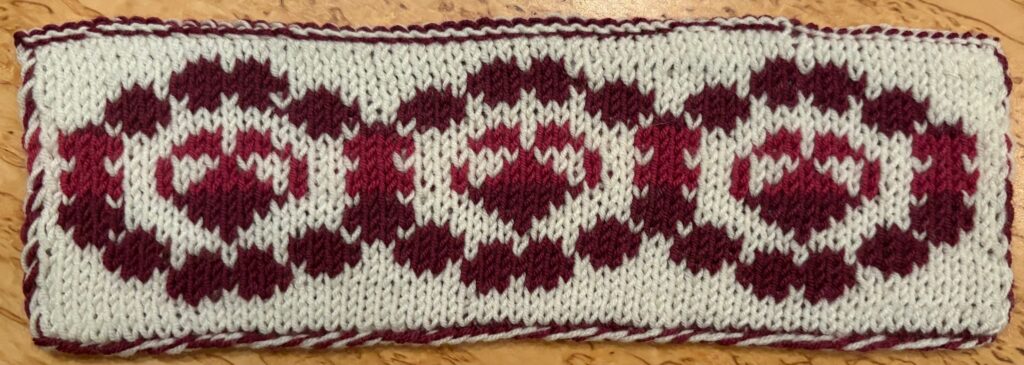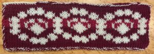 Provlappen i dubbelstickning med Viol är stickad av Harriet Axelsson 2026 som en variation på Tre hjärtan som symbol för Halmstad.
